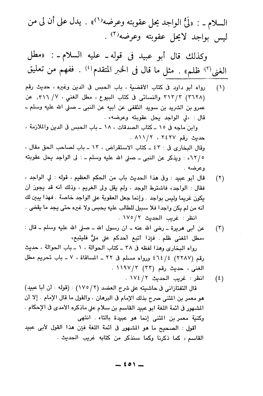 وَكَذَلِكَ قَالَ أَبُو عُبَيْدٍ فِي قَوْلِهِ - عَلَيْهِ السَّلَامُ -: " «مَطْلُ الْغَنِيِّ ظُلْمٌ» ". مِثْلَ مَا قَالَ فِي الْخَبَرِ الْمُتَقَدِّمِ. فَفُهِمَ مِنْ تَعْلِيقِ