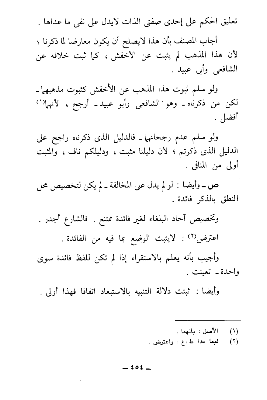تَعْلِيقَ الْحُكْمِ عَلَى إِحْدَى صِفَتَيِ الذَّاتِ لَا يَدُلُّ عَلَى نَفْيِ مَا عَدَاهَا. أَجَابَ الْمُصَنِّفُ بِأَنَّ هَذَا لَا يَصْلُحُ أَنْ يَكُونَ مُعَارِضًا لِمَا ذَكَرْنَا ; لِأَنَّ هَذَا الْمَذْهَبَ لَمْ يَثْبُتْ عَنِ الْأَخْفَشِ، كَمَا ثَبَتَ خِلَافُهُ عَنِ الشَّافِعِيِّ وَأَبِي عُبَيْدٍ.