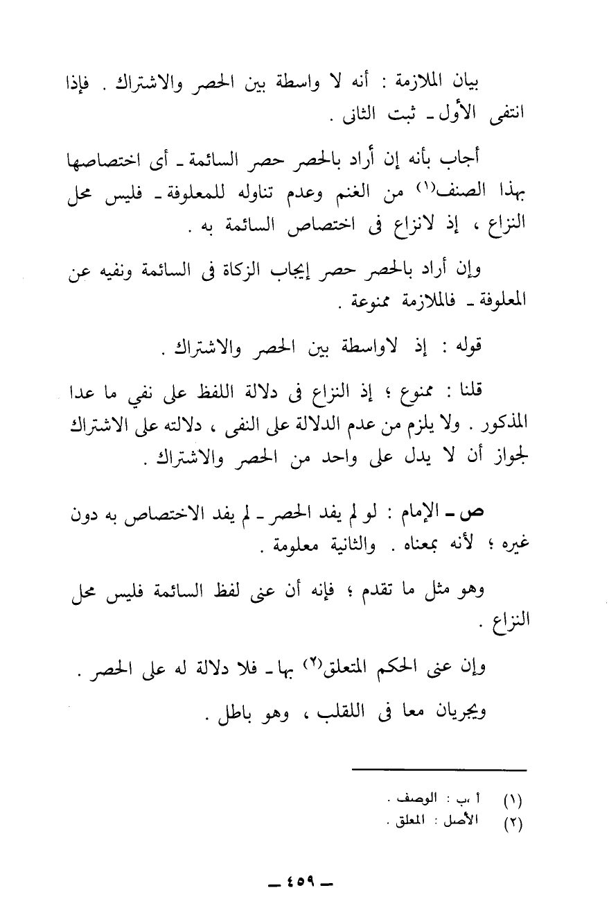 قَوْلُهُ: إِذْ لَا وَاسِطَةَ بَيْنَ الْحَصْرِ وَالِاشْتِرَاكِ.