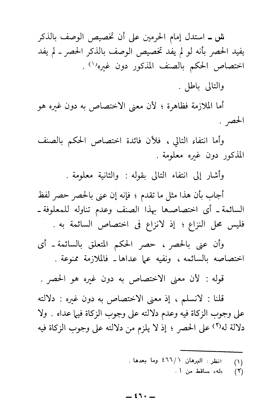 ش - اسْتَدَلَّ إِمَامُ الْحَرَمَيْنِ عَلَى أَنَّ تَخْصِيصَ الْوَصْفِ بِالذِّكْرِ يُفِيدُ الْحَصْرَ بِأَنَّهُ لَوْ لَمْ يُفِدْ تَخْصِيصُ الْوَصْفِ بِالذِّكْرِ الْحَصْرَ لَمْ يُفِدِ اخْتِصَاصَ الْحُكْمِ بِالصِّنْفِ الْمَذْكُورِ دُونَ غَيْرِهِ.