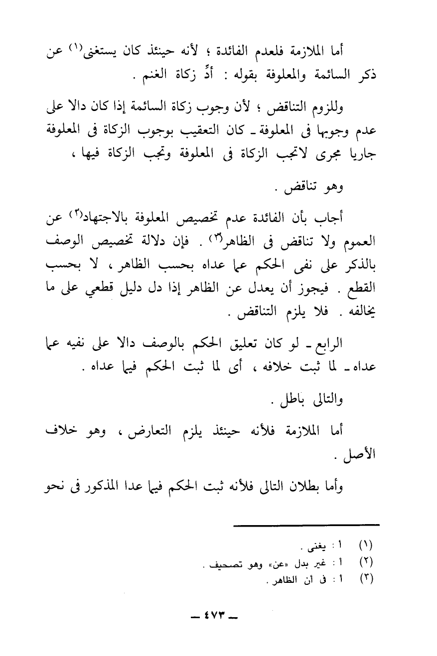 وَلِلُزُومِ التَّنَاقُضِ ; لِأَنَّ وُجُوبَ زَكَاةِ السَّائِمَةِ إِذَا كَانَ دَالًّا عَلَى عَدَمِ وُجُوبِهَا فِي الْمَعْلُوفَةِ - كَانَ التَّعْقِيبُ بِوُجُوبِ الزَّكَاةِ فِي الْمَعْلُوفَةِ جَارِيًا مَجْرَى لَا تَجِبُ الزَّكَاةُ فِي الْمَعْلُوفَةِ وَتَجِبُ الزَّكَاةُ فِيهَا؛ وَهُوَ تَنَاقُضٌ.