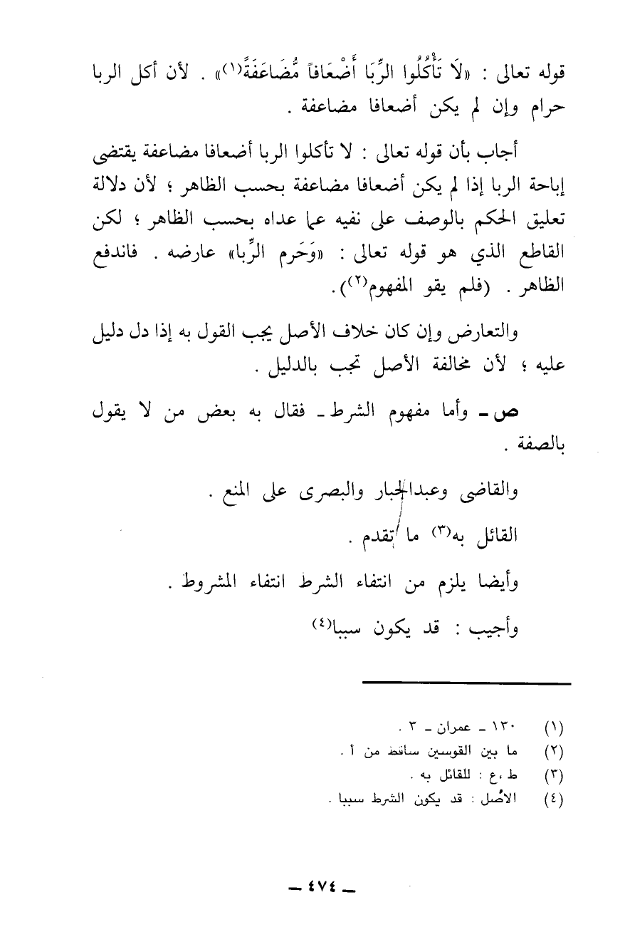 قَوْلِهِ تَعَالَى: {لَا تَأْكُلُوا الرِّبَا أَضْعَافًا مُضَاعَفَةً} [آل عمران: ١٣٠] ؛ لِأَنَّ أَكْلَ الرِّبَا حَرَامٌ وَإِنْ لَمْ يَكُنْ أَضْعَافًا مُضَاعَفَةً.