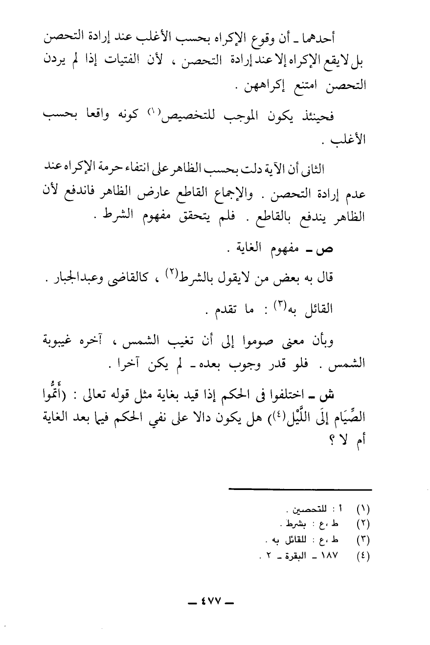 ش - اخْتَلَفُوا فِي الْحُكْمِ إِذَا قُيِّدَ بِغَايَةٍ مِثْلَ قَوْلِهِ تَعَالَى: {أَتِمُّوا الصِّيَامَ إِلَى اللَّيْلِ} [البقرة: ١٨٧] هَلْ يَكُونُ دَالًّا عَلَى نَفْيِ الْحُكْمِ فِيمَا بَعْدَ الْغَايَةِ أَمْ لَا؟ .