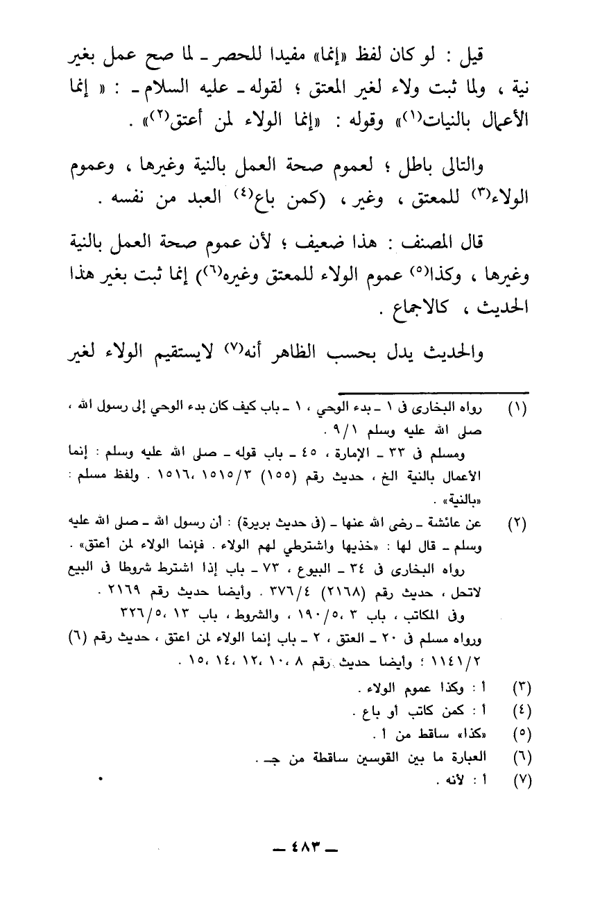 قَالَ الْمُصَنِّفُ: هَذَا ضَعِيفٌ؛ لِأَنَّ عُمُومَ صِحَّةِ الْعَمَلِ بِالنِّيَّةِ وَغَيْرِهَا، وَكَذَا عُمُومُ الْوَلَاءِ لِلْمُعْتِقِ وَغَيْرِهِ) إِنَّمَا ثَبَتَ بِغَيْرِ هَذَا الْحَدِيثِ، كَالْإِجْمَاعِ.