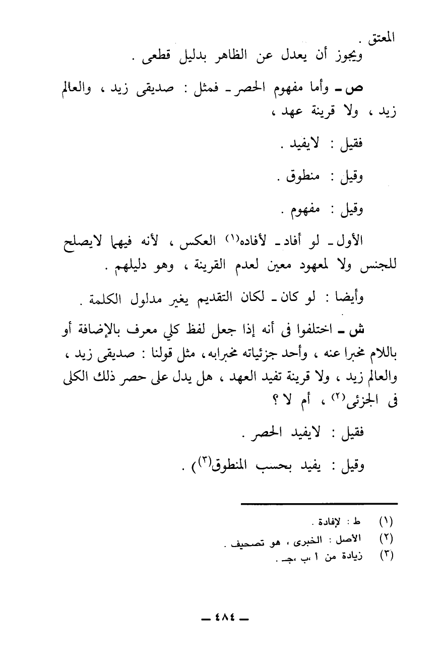 ش - اخْتَلَفُوا فِي أَنَّهُ إِذَا جُعِلَ لَفْظٌ كُلِّيٌّ مُعَرَّفٌ بِالْإِضَافَةِ أَوْ بِاللَّامِ مُخْبَرًا عَنْهُ، وَأَحَدُ جُزْئِيَّاتِهِ مُخْبَرًا بِهِ، مِثْلَ قَوْلِنَا: صَدِيقِي زَيْدٌ وَالْعَالِمُ زَيْدٌ، وَلَا قَرِينَةَ تُفِيدُ الْعَهْدَ - هَلْ يَدُلُّ عَلَى حَصْرِ ذَلِكَ الْكُلِيِّ فِي الْجُزْئِيِّ أَمْ لَا؟ .