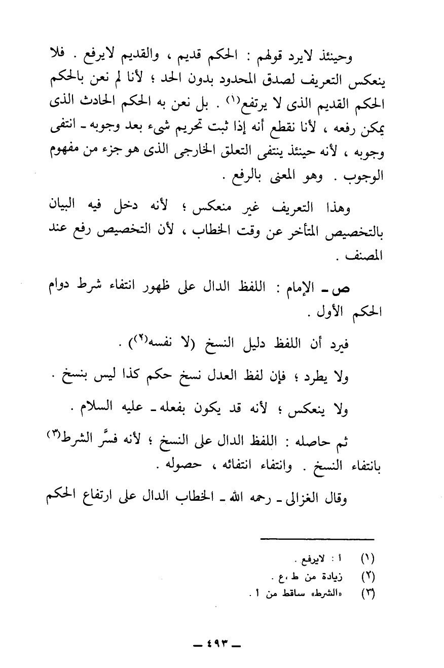 ش - عَرَّفَ إِمَامُ الْحَرَمَيْنِ النَّسْخَ بِأَنَّهُ اللَّفْظُ الدَّالُّ عَلَى ظُهُورِ انْتِفَاءِ شَرْطِ دَوَامِ الْحُكْمِ الْأَوَّلِ.