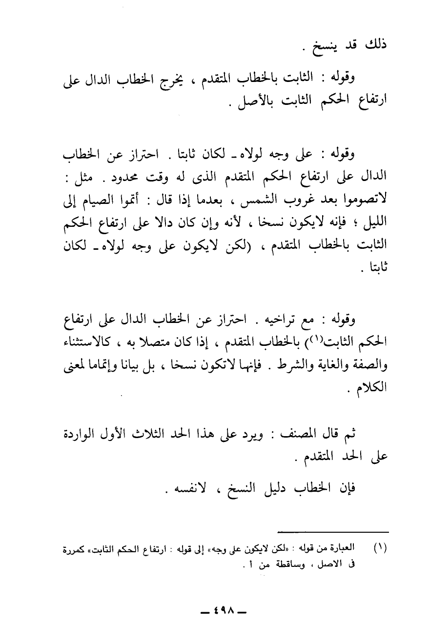 وَقَوْلُهُ: عَلَى وَجْهٍ لَوْلَاهُ لَكَانَ ثَابِتًا. احْتِرَازٌ عَنِ الْخِطَابِ الدَّالِّ عَلَى ارْتِفَاعِ الْحُكْمِ الْمُتَقَدِّمِ الَّذِي لَهُ وَقْتٌ مَحْدُودٌ، مِثْلَ: لَا تَصُومُوا بَعْدَ غُرُوبِ الشَّمْسِ، بَعْدَ مَا إِذَا قَالَ: {أَتِمُّوا الصِّيَامَ إِلَى اللَّيْلِ} [البقرة: ١٨٧] ; فَإِنَّهُ لَا يَكُونُ نَسْخًا؛ لِأَنَّهُ وَإِنْ كَانَ دَالًّا عَلَى ارْتِفَاعِ الْحُكْمِ الثَّابِتِ بِالْخِطَابِ الْمُتَقَدِّمِ، لَكِنْ لَا يَكُونُ عَلَى وَجْهٍ لَوْلَاهُ لَكَانَ ثَابِتًا.