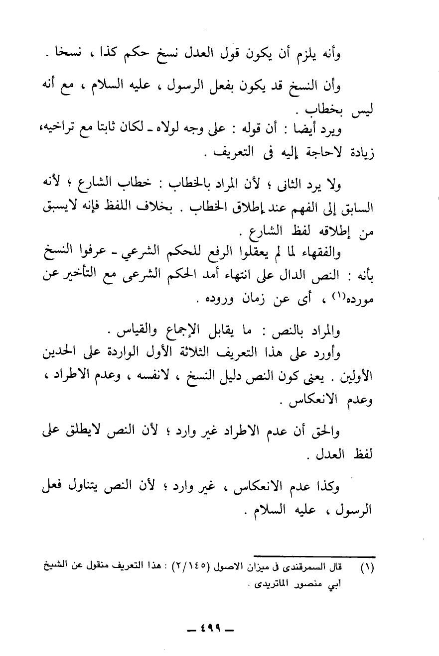 وَالْفُقَهَاءُ لَمَّا لَمْ يَعْقِلُوا الرَّفْعَ لِلْحُكْمِ الشَّرْعِيِّ عَرَّفُوا النَّسْخَ بِأَنَّهُ: النَّصُّ الدَّالُّ عَلَى انْتِهَاءِ أَمَدِ الْحُكْمِ الشَّرْعِيِّ مَعَ التَّأْخِيرِ عَنْ مَوْرِدِهِ، أَيْ عَنْ زَمَانِ وُرُودِهِ.