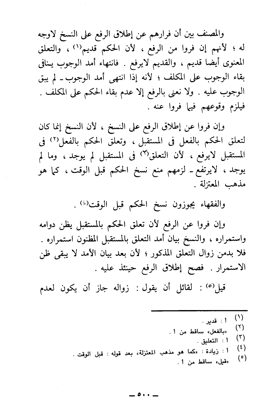 وَإِنْ فَرُّوا عَنْ إِطْلَاقِ النَّسْخِ، لِأَنَّ النَّسْخَ إِنَّمَا كَانَ لِتَعَلُّقِ الْحُكْمِ بِالْفِعْلِ فِي الْمُسْتَقْبَلِ، وَتَعَلُّقُ الْحُكْمِ بِالْفِعْلِ فِي الْمُسْتَقْبَلِ لَا يُرْفَعُ؛ لِأَنَّ التَّعَلُّقَ فِي الْمُسْتَقْبَلِ لَمْ يُوجَدْ، وَمَا لَمْ يُوجَدْ، لَا يَرْتَفِعُ - لَزِمَهُمْ مَنْعُ نَسْخِ الْحُكْمِ قَبْلَ الْوَقْتِ، كَمَا هُوَ مَذْهَبُ الْمُعْتَزِلَةِ.