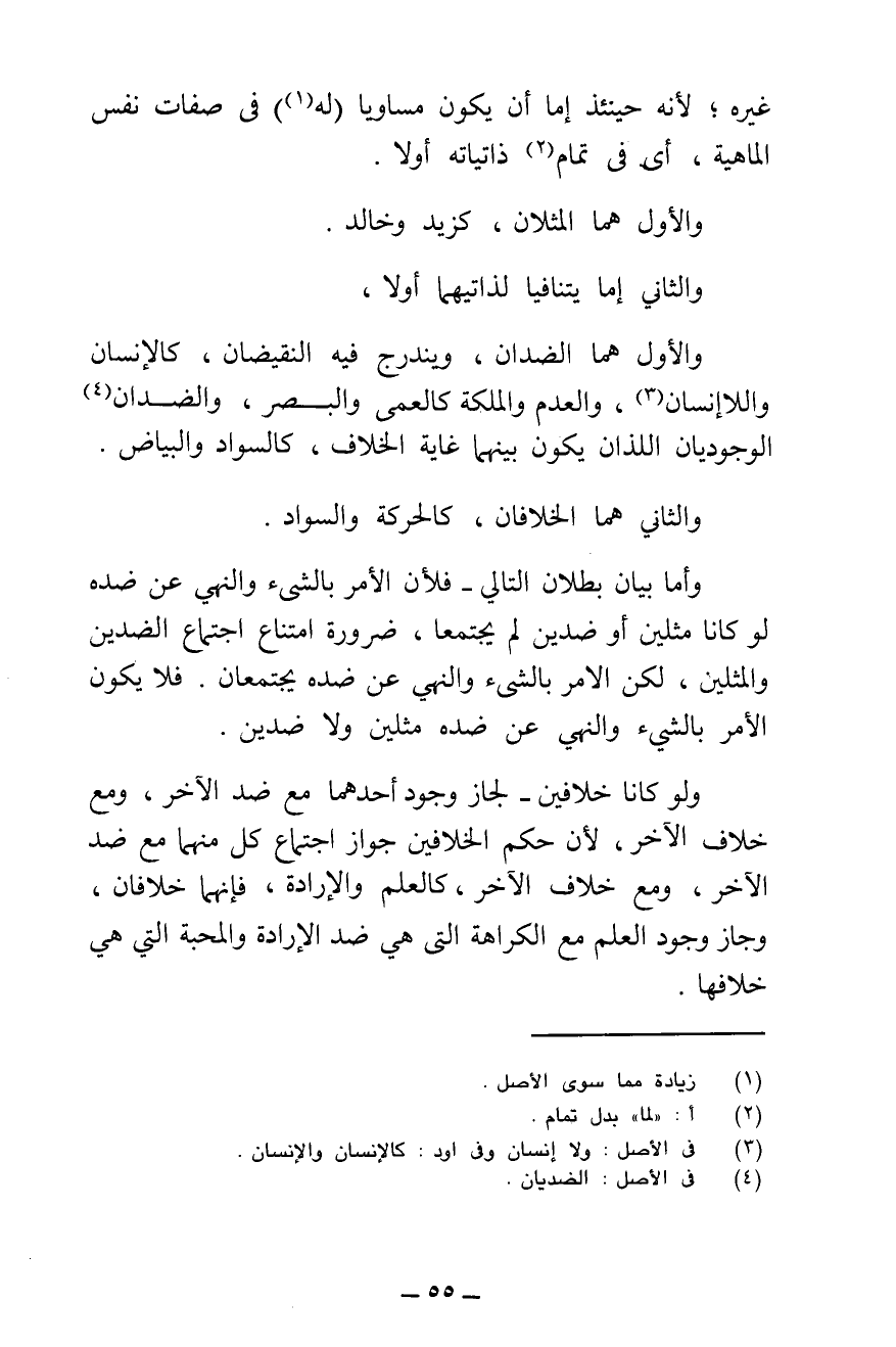 وَالْأَوَّلُ هُمَا الضِّدَّانِ، وَيَنْدَرِجُ فِيهِ النَّقِيضَانِ، كَالْإِنْسَانِ وَاللَّا إِنْسَانِ ; وَالْعَدَمِ وَالْمَلَكَةِ كَالْعَمَى وَالْبَصَرِ، وَالضِّدَّانِ الْوُجُودِيَّانِ اللَّذَانِ يَكُونُ بَيْنَهُمَا غَايَةُ الْخِلَافِ، كَالسَّوَادِ وَالْبَيَاضِ.