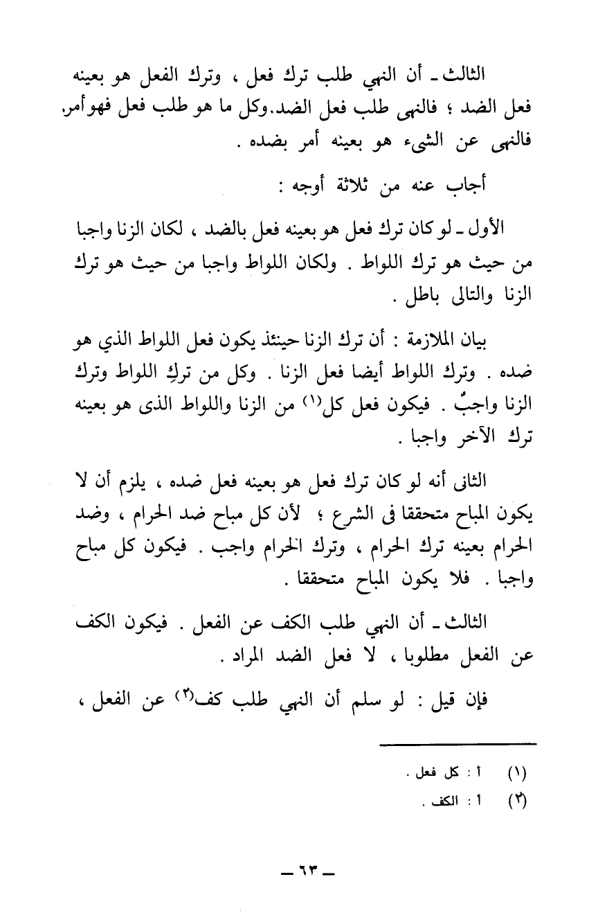 الْأَوَّلُ - لَوْ كَانَ تَرْكُ فِعْلٍ هُوَ بِعَيْنِهِ فِعْلٌ بِالضِّدِّ، لَكَانَ الزِّنَا وَاجِبًا مِنْ حَيْثُ هُوَ تَرْكُ اللِّوَاطِ، وَلَكَانَ اللِّوَاطُ وَاجِبًا مِنْ حَيْثُ هُوَ تَرْكُ الزِّنَا، وَالتَّالِي بَاطِلٌ.