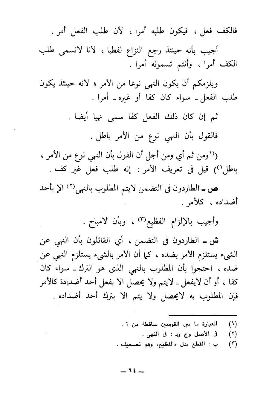 أُجِيبُ بِأَنَّهُ حِينَئِذٍ رَجَعَ النِّزَاعُ لَفْظِيًّا، لِأَنَّا لَا نُسَمِّي طَلَبَ الْكَفِّ أَمْرًا، وَأَنْتُمْ تُسَمُّونَهُ أَمْرًا.