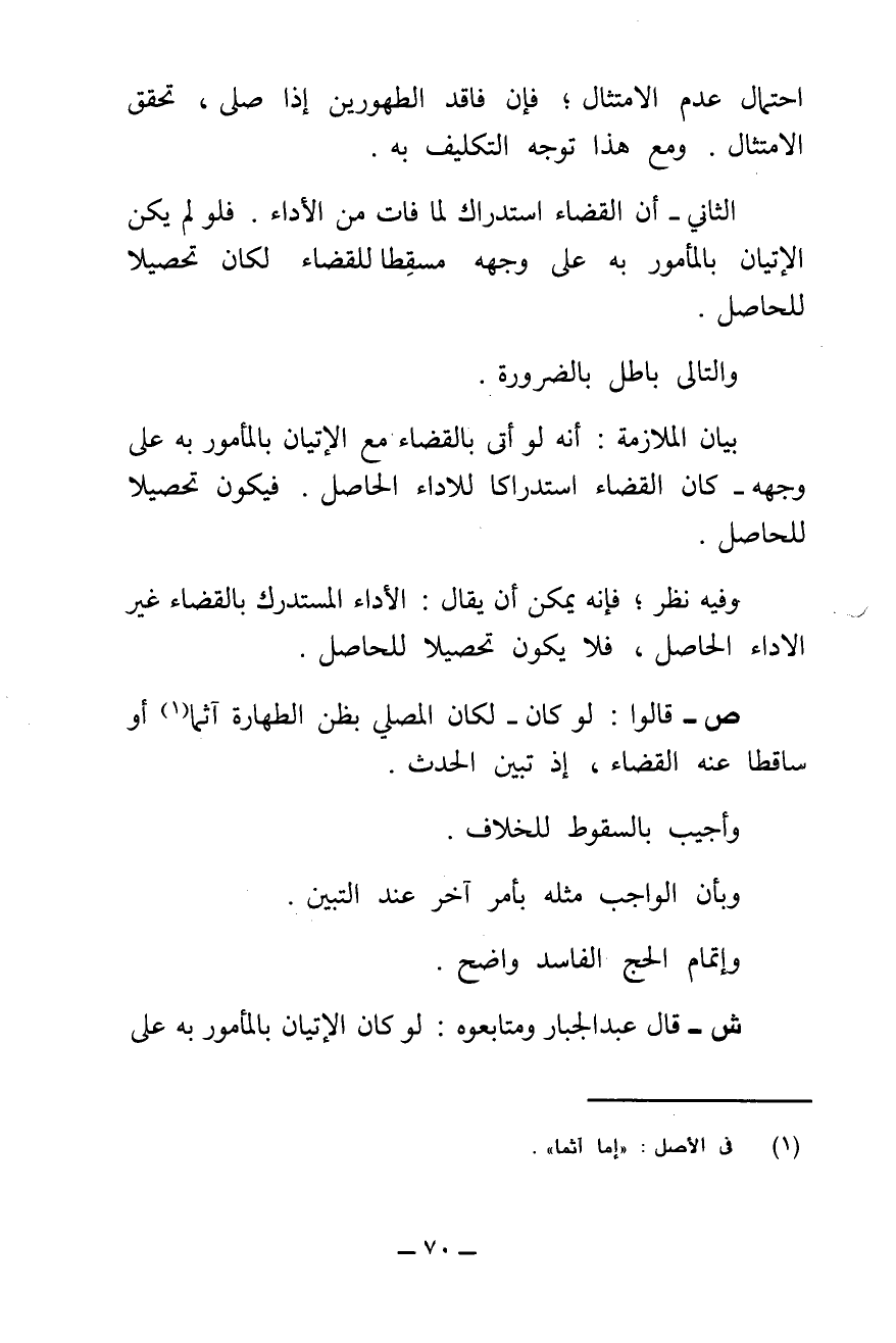 ش - قَالَ عَبْدُ الْجَبَّارِ وَمُتَابِعُوهُ: لَوْ كَانَ الْإِتْيَانُ بِالْمَأْمُورِ بِهِ عَلَى