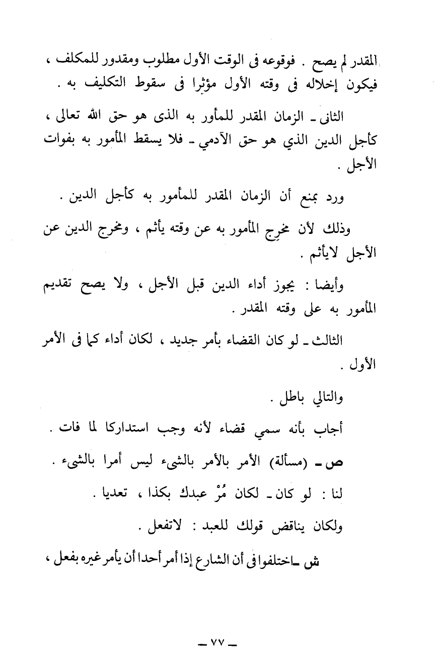 الثَّانِي: الزَّمَانُ الْمُقَدَّرُ لِلْمَأْمُورِ بِهِ الَّذِي هُوَ حَقُّ اللَّهِ تَعَالَى، كَأَجَلِ الدَّيْنِ الَّذِي هُوَ حَقُّ الْآدَمِيِّ - فَلَا يَسْقُطُ الْمَأْمُورُ بِهِ بِفَوَاتِ الْأَجَلِ.