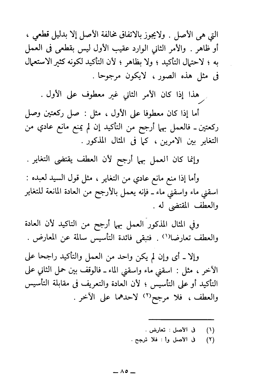 وَفِي الْمِثَالِ الْمَذْكُورِ الْعَمَلُ بِهِمَا أَرْجَحُ مِنَ التَّأْكِيدِ؛ لِأَنَّ الْعَادَةَ وَالْعَطْفَ تَعَارَضَا. فَتَبْقَى فَائِدَةُ التَّأْسِيسِ سَالِمَةً عَنِ الْمُعَارِضِ.