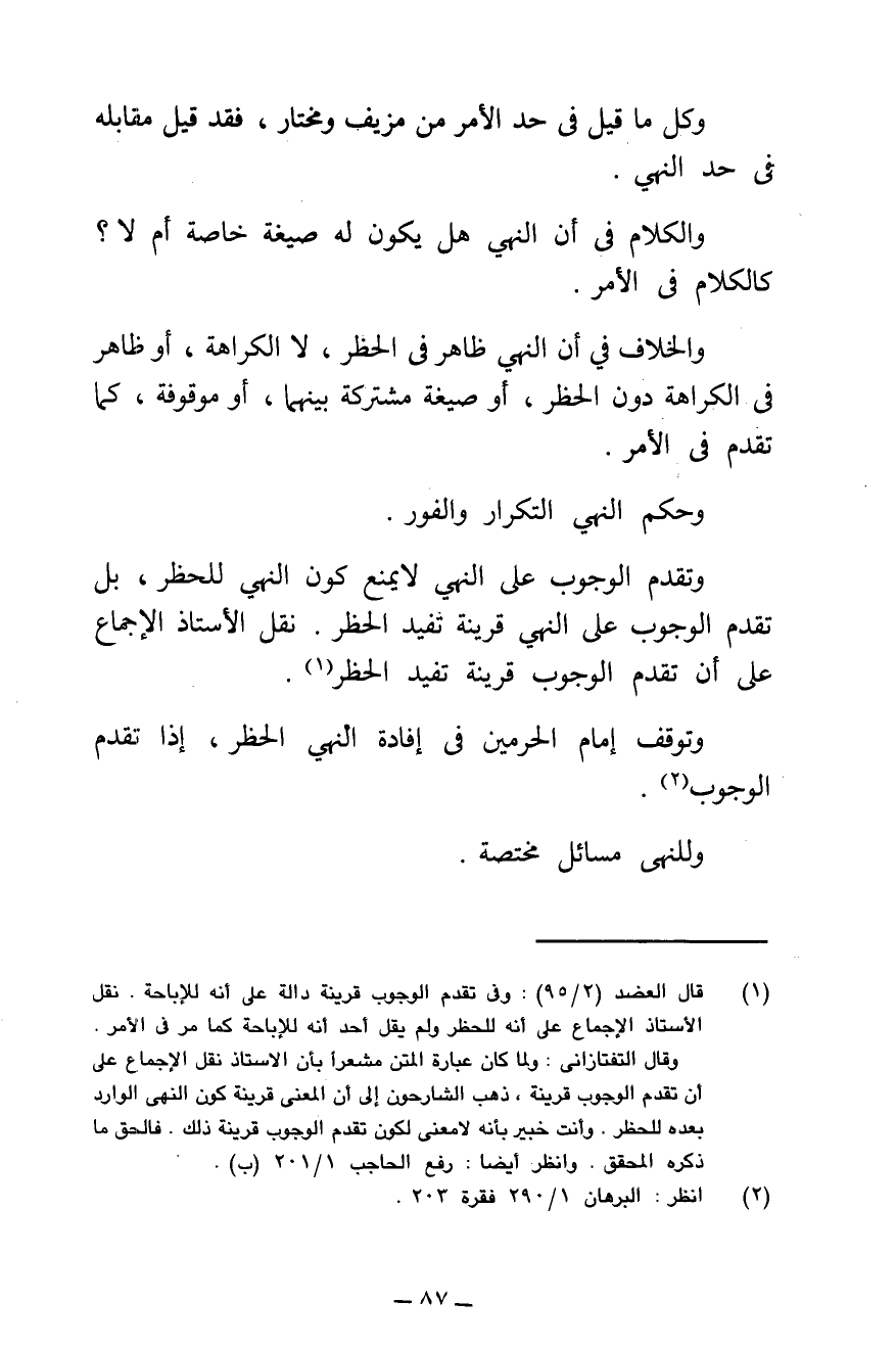 وَتَقَدُّمُ الْوُجُوبِ عَلَى النَّهْيِ لَا يَمْنَعُ كَوْنَ النَّهْيِ لِلْحَظْرِ، بَلْ تَقَدُّمُ الْوُجُوبِ عَلَى النَّهْيِ قَرِينَةٌ تُفِيدُ الْحَظْرَ، نَقَلَ الْأُسْتَاذُ الْإِجْمَاعَ عَلَى أَنَّ تَقَدُّمَ الْوُجُوبِ قَرِينَةٌ تُفِيدُ الْحَظْرَ.