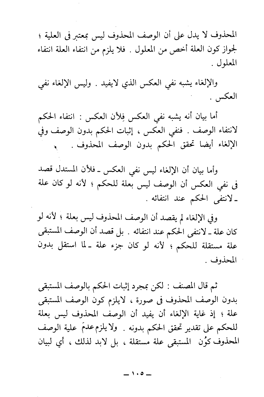 الْمَحْذُوفِ لَا يَدُلُّ عَلَى أَنَّ الْوَصْفَ الْمَحْذُوفَ لَيْسَ بِمُعْتَبَرٍ فِي الْعِلِّيَّةِ ; لِجَوَازِ كَوْنِ الْعِلَّةِ أَخَصَّ مِنَ الْمَعْلُولِ، فَلَا يَلْزَمُ مِنِ انْتِفَاءِ الْعِلَّةِ انْتِفَاءُ الْمَعْلُولِ.