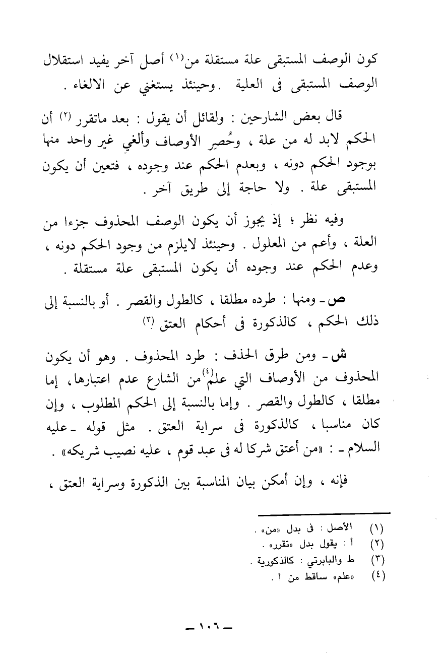 ش - وَمِنْ طُرُقِ الْحَذْفِ: طَرْدُ الْمَحْذُوفِ، وَهُوَ أَنْ يَكُونَ الْمَحْذُوفُ مِنَ الْأَوْصَافِ الَّتِي عُلِمَ مِنَ الشَّارِعِ عَدَمُ اعْتِبَارِهَا، إِمَّا مُطْلَقًا، كَالطُّولِ وَالْقِصَرِ، وَإِمَّا بِالنِّسْبَةِ إِلَى الْحُكْمِ الْمَطْلُوبِ، وَإِنْ كَانَ مُنَاسِبًا، كَالذُّكُورَةِ فِي سَرَايَةِ الْعِتْقِ، مِثْلَ قَوْلِهِ - عَلَيْهِ السَّلَامُ: " «مَنْ أَعْتَقَ شِرْكًا لَهُ فِي عَبْدِ قَوْمٍ، عَلَيْهِ نَصِيبُ شَرِيكِهِ» ،. فَإِنَّهُ وَإِنْ أَمْكَنَ بَيَانُ الْمُنَاسَبَةِ بَيْنَ الذُّكُورَةِ وَسَرَايَةِ الْعِتْقِ،