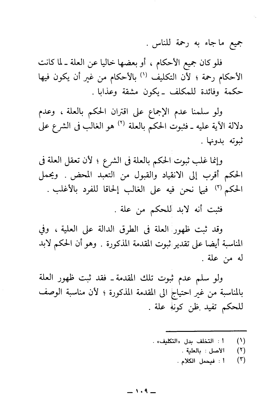 فَلَوْ كَانَ جَمِيعُ الْأَحْكَامِ، أَوْ بَعْضُهَا خَالِيًا عَنِ الْعِلَّةِ، لَمَا كَانَتِ الْأَحْكَامُ رَحْمَةً ; لِأَنَّ التَّكْلِيفَ بِالْأَحْكَامِ مِنْ غَيْرِ أَنْ يَكُونَ فِيهَا حِكْمَةٌ وَفَائِدَةٌ لِلْمُكَلَّفِ، يَكُونُ مَشَقَّةً وَعَذَابًا.