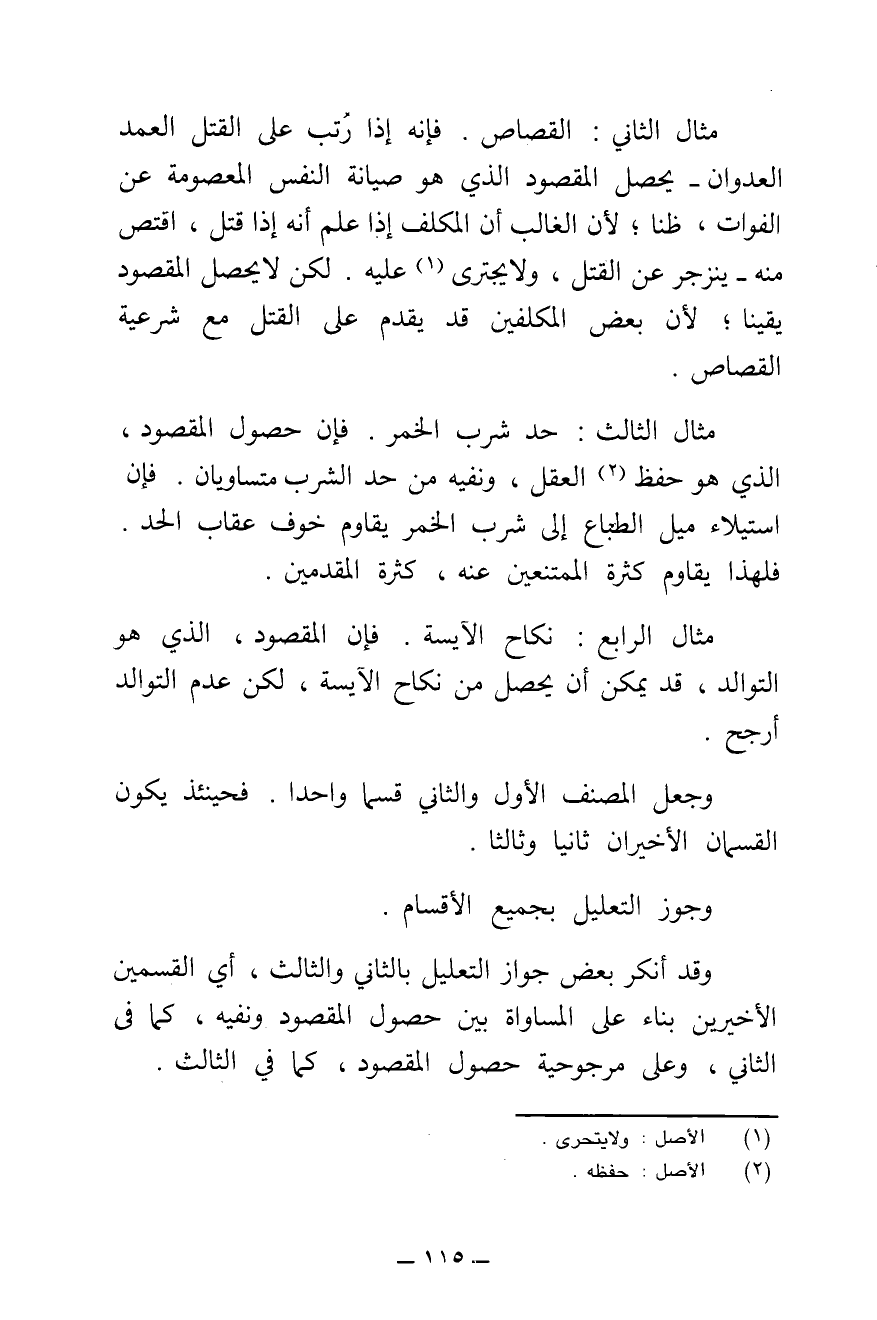 مِثَالُ الثَّانِي: الْقِصَاصُ، فَإِنَّهُ إِذَا رُتِّبَ عَلَى الْقَتْلِ الْعَمْدِ الْعُدْوَانُ، يَحْصُلُ الْمَقْصُودُ الَّذِي هُوَ صِيَانَةُ النَّفْسِ الْمَعْصُومَةِ عَنِ الْفَوَاتِ ظَنًّا ; لِأَنَّ الْغَالِبَ أَنَّ الْمُكَلَّفَ إِذَا عَلِمَ أَنَّهُ إِذَا قَتَلَ، اقْتُصَّ مِنْهُ، يَنْزَجِرُ عَنِ الْقَتْلِ، وَلَا يَجْتَرِي عَلَيْهِ، لَكِنْ لَا يَحْصُلُ الْمَقْصُودُ يَقِينًا ; لِأَنَّ بَعْضَ الْمُكَلَّفِينَ قَدْ يُقْدِمُ عَلَى الْقَتْلِ مَعَ شَرْعِيَّةِ الْقِصَاصِ.