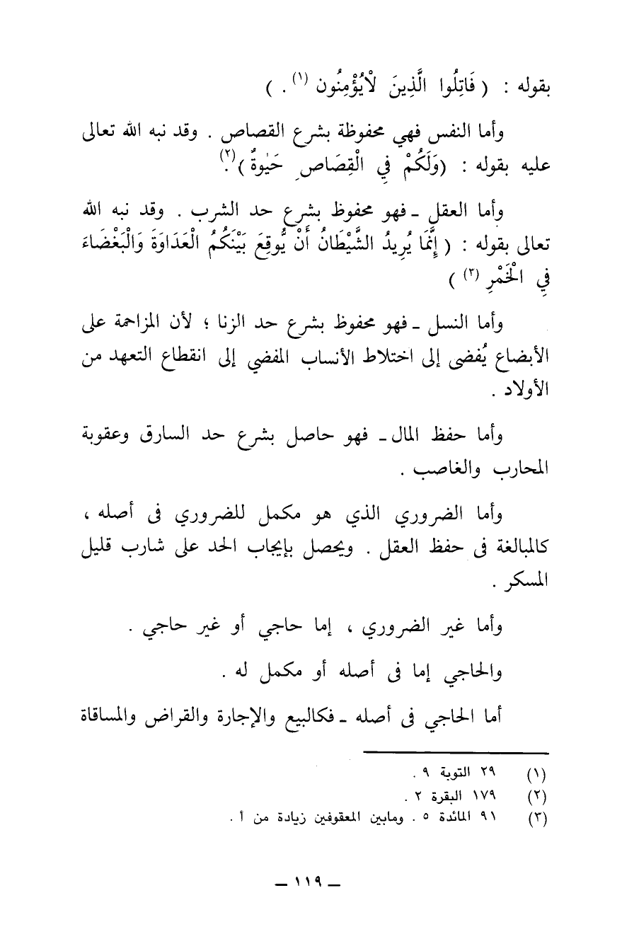 وَأَمَّا النَّفْسُ فَهِيَ مَحْفُوظَةٌ بِشَرْعِ الْقِصَاصِ، وَقَدْ نَبَّهَ اللَّهُ - تَعَالَى - عَلَيْهِ بِقَوْلِهِ: {وَلَكُمْ فِي الْقِصَاصِ حَيَاةٌ} [البقرة: ١٧٩] .