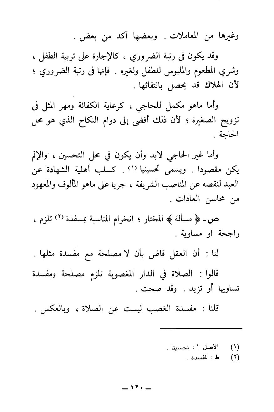 وَأَمَّا مَا هُوَ مُكَمِّلٌ لِلْحَاجِيِّ، كَرِعَايَةِ الْكَفَاءَةِ، وَمَهْرِ الْمِثْلِ فِي تَزْوِيجِ الصَّغِيرَةِ ; لِأَنَّ ذَلِكَ أَفْضَى إِلَى دَوَامِ النِّكَاحِ الَّذِي هُوَ مَحَلُّ الْحَاجَةِ، وَأَمَّا غَيْرُ الْحَاجِيِّ لَا بُدَّ وَأَنْ يَكُونَ فِي مَحَلِّ التَّحْسِينِ، وَإِلَّا لَمْ يَكُنْ مَقْصُودًا، وَيُسَمَّى تَحْسِينِيًّا، كَسَلْبِ أَهْلِيَّةِ الشَّهَادَةِ عَنِ الْعَبْدِ لِنَقْصِهِ عَنِ الْمَنَاصِبِ الشَّرِيفَةِ، جَرْيًا عَلَى مَا هُوَ الْمَأْلُوفُ وَالْمَعْهُودُ مِنْ مَحَاسِنِ الْعَادَاتِ.