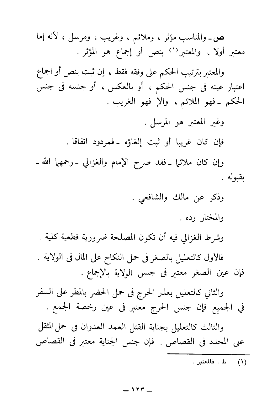 وَالْمُعْتَبَرُ بِتَرْتِيبِ الْحُكْمِ عَلَى وِفْقِهِ فَقَطْ، إِنْ ثَبَتَ بِنَصٍّ أَوْ إِجْمَاعٍ اعْتِبَارُ عَيْنِهِ فِي جِنْسِ الْحُكْمِ، أَوْ بِالْعَكْسِ، أَوْ جِنْسُهُ فِي جِنْسِ الْحُكْمِ، فَهُوَ الْمُلَائِمُ، وَإِلَّا فَهُوَ الْغَرِيبُ.