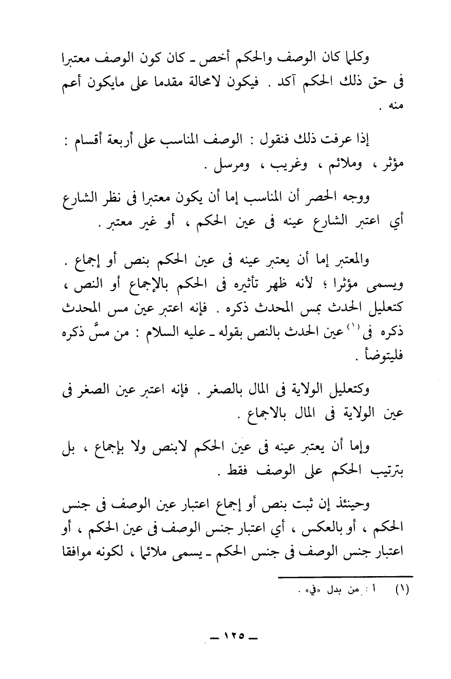 وَكُلَّمَا كَانَ الْوَصْفُ وَالْحُكْمُ أَخَصَّ، كَانَ كَوْنُ الْوَصْفِ مُعْتَبَرًا فِي حَقِّ ذَلِكَ الْحُكْمِ آكَدَ، فَيَكُونُ لَا مَحَالَةَ مُقَدَّمًا عَلَى مَا يَكُونُ أَعَمَّ مِنْهُ. إِذَا عَرَفْتَ ذَلِكَ فَنَقُولُ: الْوَصْفُ الْمُنَاسِبُ عَلَى أَرْبَعَةِ أَقْسَامٍ: مُؤَثِّرٌ، وَمُلَائِمٌ، وَغَرِيبٌ، وَمُرْسَلٌ. وَوَجْهُ الْحَصْرِ أَنَّ الْمُنَاسِبَ إِمَّا أَنْ يَكُونَ مُعْتَبَرًا فِي نَظَرِ الشَّارِعِ، أَيِ اعْتَبَرَ الشَّارِعُ عَيْنَهُ فِي عَيْنِ الْحُكْمِ، أَوْ غَيْرَ مُعْتَبَرٍ.