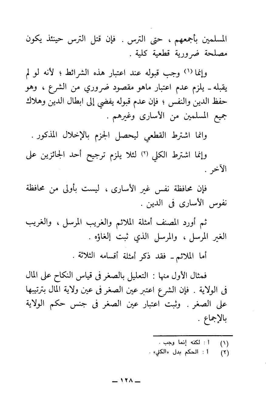 وَإِنَّمَا اشْتُرِطَ الْقَطْعِيُّ; لِيَحْصُلَ الْجَزْمُ بِالْإِخْلَالِ الْمَذْكُورِ، وَإِنَّمَا اشْتُرِطَ الْكُلِّيُّ، لِئَلَّا يَلْزَمَ تَرْجِيحُ أَحَدِ الْجَائِزَيْنِ عَلَى الْآخَرِ. فَإِنَّ مُحَافَظَةَ نَفْسِ غَيْرِ الْأُسَارَى، لَيْسَتْ بِأَوْلَى مِنْ مُحَافَظَةِ نُفُوسِ الْأُسَارَى فِي الدِّينِ.