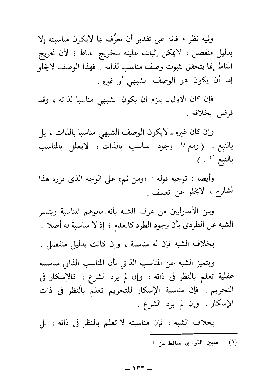 وَفِيهِ نَظَرٌ، فَإِنَّهُ عَلَى تَقْدِيرِ أَنْ يُعَرَّفَ بِمَا لَا يَكُونُ مُنَاسَبَتُهُ إِلَّا بِدَلِيلٍ مُنْفَصِلٍ، لَا يُمْكِنُ إِثْبَاتُ عِلِّيَّتِهِ بِتَخْرِيجِ الْمَنَاطِ ; لِأَنَّ تَخْرِيجَ الْمَنَاطِ إِنَّمَا يَتَحَقَّقُ بِثُبُوتِ وَصْفٍ مُنَاسِبٍ لِذَاتِهِ، فَهَذَا الْوَصْفُ لَا يَخْلُو إِمَّا أَنْ يَكُونَ هُوَ الْوَصْفَ الشَّبَهِيَّ، أَوْ غَيْرَهُ.