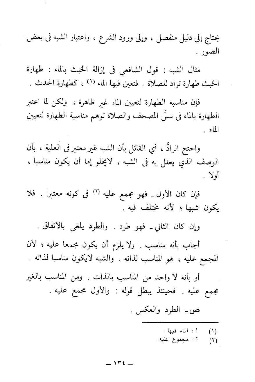 مِثَالُ الشَّبَهِ قَوْلُ الشَّافِعِيِّ فِي إِزَالَةِ الْخَبَثِ بِالْمَاءِ: طَهَارَةُ الْخَبَثِ طَهَارَةٌ تُرَادُ لِلصَّلَاةِ. فَتَعَيَّنَ فِيهَا الْمَاءُ، كَطَهَارَةِ الْحَدَثِ. فَإِنَّ مُنَاسَبَةَ الطَّهَارَةِ لِتَعْيِينِ الْمَاءِ غَيْرُ ظَاهِرَةٍ، وَلَكِنْ لَمَّا اعْتَبَرَ الطَّهَارَةَ بِالْمَاءِ فِي مَسِّ الْمُصْحَفِ وَالصَّلَاةِ تَوَهَّمَ مُنَاسَبَةَ الطَّهَارَةِ لِتَعْيِينِ الْمَاءِ.