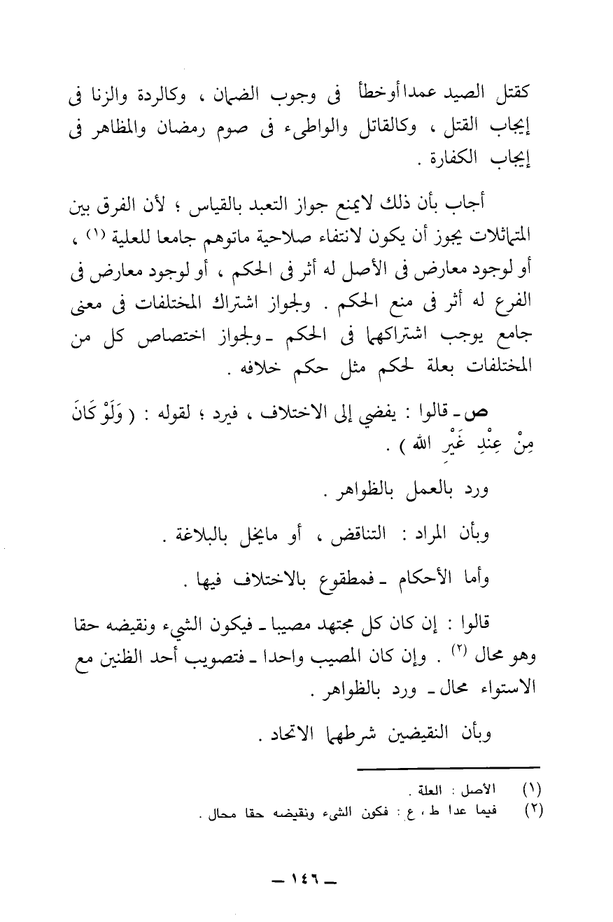 أَجَابَ بِأَنَّ ذَلِكَ لَا يَمْنَعُ جَوَازَ التَّعَبُّدِ بِالْقِيَاسِ ; لِأَنَّ الْفَرْقَ بَيْنَ الْمُتَمَاثِلَاتِ يُجَوِّزُ أَنْ يَكُونَ لِانْتِفَاءِ صَلَاحِيَةِ مَا تُوُهِّمَ جَامِعًا لِلْعَلِيَّةِ، أَوْ لِوُجُودِ مُعَارِضٍ فِي الْأَصْلِ لَهُ أَثَرٌ فِي الْحُكْمِ، أَوْ لِوُجُودِ مُعَارِضٍ فِي الْفَرْعِ لَهُ أَثَرٌ فِي مَنْعِ الْحُكْمِ، وَلِجَوَازِ اشْتِرَاكِ الْمُخْتَلِفَاتِ فِي مَعْنًى جَامِعٍ يُوجِبُ اشْتِرَاكَهُمَا فِي الْحُكْمِ، وَلِجَوَازِ اخْتِصَاصِ كُلٍّ مِنَ الْمُخْتَلِفَاتِ بِعِلَّةٍ لِحُكْمٍ مِثْلِ حُكْمِ خِلَافِهِ.