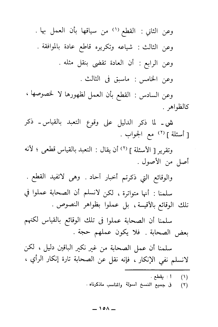 ص - وَاسْتَدَلَّ بِمَا تَوَاتَرَ مَعْنَاهُ مِنْ ذِكْرِ الْعِلَلِ لِيَبْتَنِي عَلَيْهَا، مِثْلَ: " «أَرَأَيْتِ لَوْ كَانَ عَلَى أَبِيكِ دَيْنٌ» "، " «أَيَنْقُصُ الرُّطَبُ إِذَا جَفَّ» "، وَلَيْسَ بِالْبَيْنِ.
