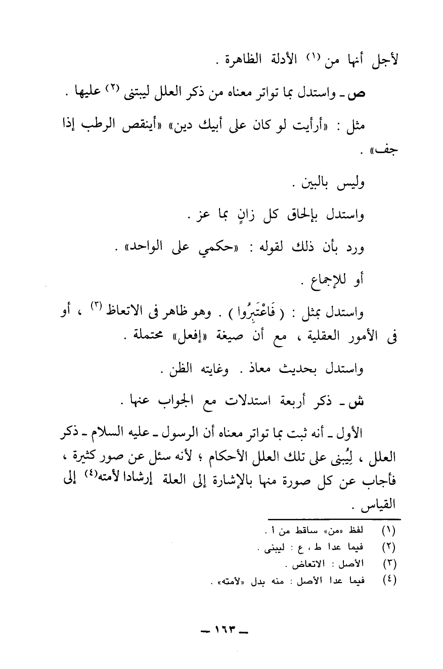 الْأَوَّلُ: أَنَّهُ ثَبَتَ بِمَا تَوَاتَرَ مَعْنَاهُ أَنَّ الرَّسُولَ - عَلَيْهِ السَّلَامُ - ذَكَرَ الْعِلَلَ ; لِيَبْنِيَ عَلَى تِلْكَ الْعِلَلِ الْأَحْكَامَ ; لِأَنَّهُ سُئِلَ عَنْ صُوَرٍ كَثِيرَةٍ، فَأَجَابَ عَنْ كُلِّ صُورَةٍ مِنْهَا بِالْإِشَارَةِ إِلَى الْعِلَّةِ إِرْشَادًا لِأُمَّتِهِ إِلَى الْقِيَاسِ.