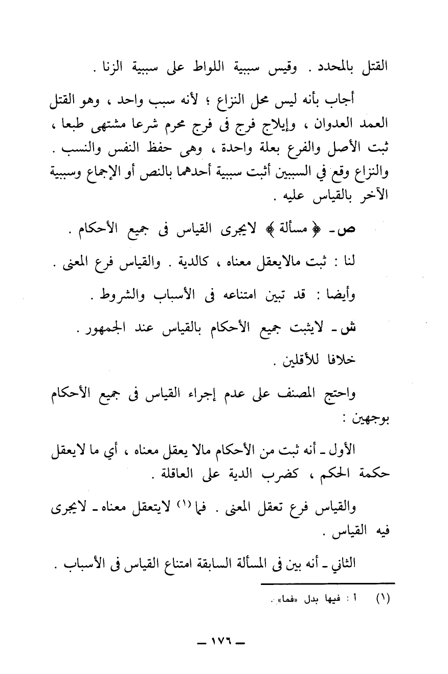 ش - لَا يَثْبُتُ جَمِيعُ الْأَحْكَامِ بِالْقِيَاسِ عِنْدَ الْجُمْهُورِ، خِلَافًا لِلْأَقَلِّينَ، وَاحْتَجَّ الْمُصَنِّفُ عَلَى عَدَمِ إِجْرَاءِ الْقِيَاسِ فِي جَمِيعِ الْأَحْكَامِ بِوَجْهَيْنِ: