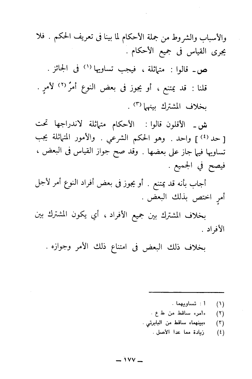 ش - الْأَقَلُّونَ قَالُوا: الْأَحْكَامُ مُتَمَاثِلَةٌ لِانْدِرَاجِهَا تَحْتَ حَدٍّ وَاحِدٍ، وَهُوَ الْحُكْمُ الشَّرْعِيُّ، وَالْأُمُورُ الْمُتَمَاثِلَةُ يَجِبُ تَسَاوِيهَا فِيمَا جَازَ عَلَى بَعْضِهَا، وَقَدْ صَحَّ جَوَازُ الْقِيَاسِ فِي الْبَعْضِ، فَيَصِحُّ فِي الْجَمِيعِ.