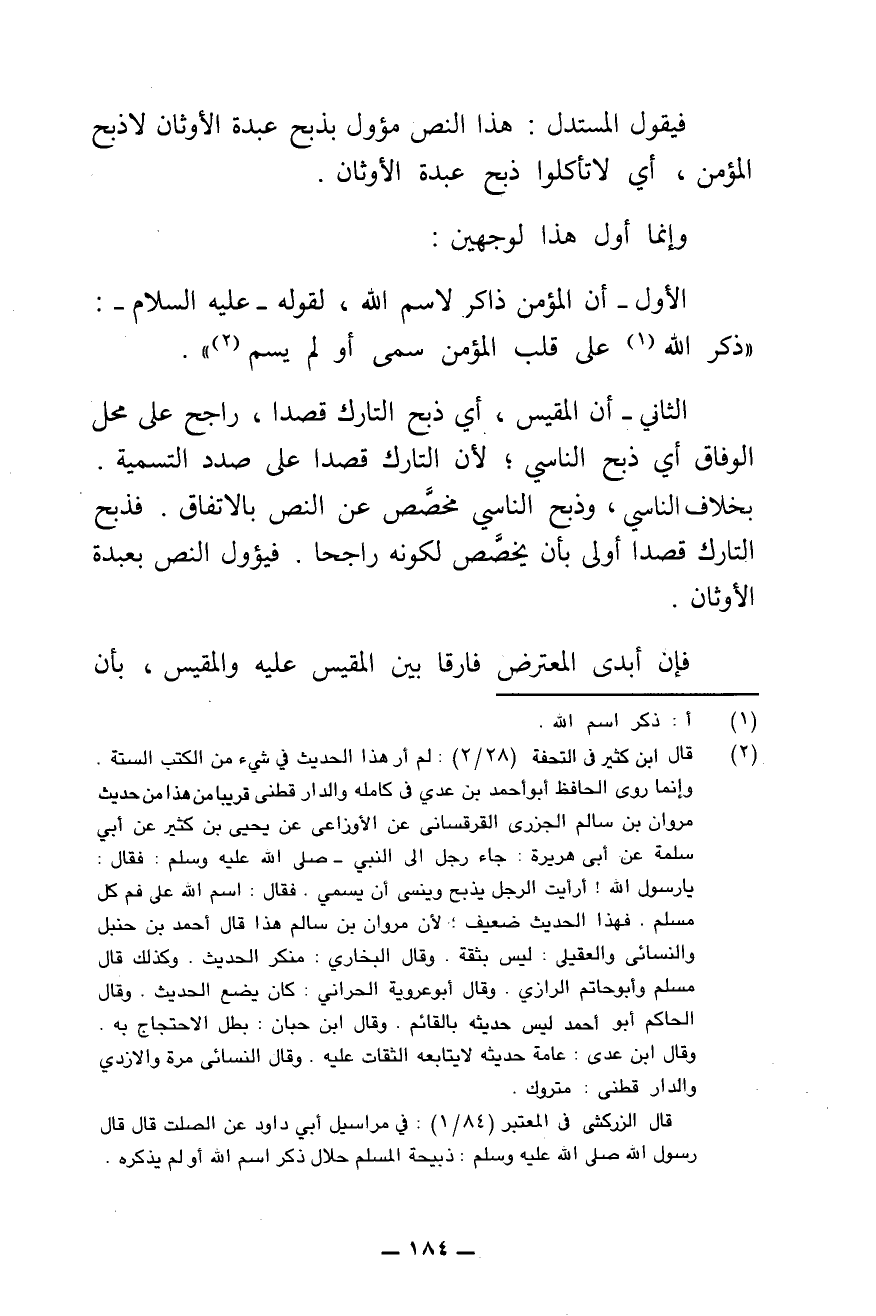 الثَّانِي: أَنَّ الْمَقِيسَ، أَيْ ذَبْحَ التَّارِكِ قَصْدًا رَاجِحٌ عَلَى مَحَلِّ الْوِفَاقِ أَيْ ذَبْحِ النَّاسِي ; لِأَنَّ التَّارِكَ قَصْدًا عَلَى صَدَدِ التَّسْمِيَةِ، بِخِلَافِ النَّاسِي، وَذَبْحُ النَّاسِي مُخَصَّصٌ عَنِ النَّصِّ بِالِاتِّفَاقِ، فَذَبْحُ التَّارِكِ قَصْدًا أَوْلَى بِأَنْ يُخَصَّصَ لِكَوْنِهِ رَاجِحًا، فَيُئَوَّلُ النَّصُّ بِعَبَدَةِ الْأَوْثَانِ، فَإِنْ أَبْدَى الْمُعْتَرِضُ فَارِقًا بَيْنَ الْمَقِيسِ عَلَيْهِ وَالْمَقِيسِ، بِأَنْ