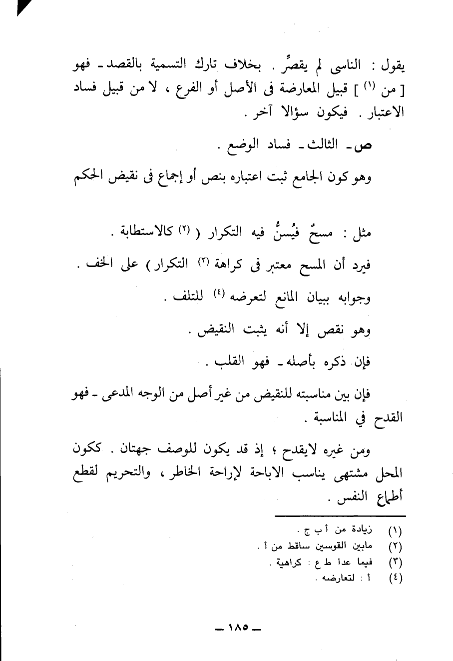ش - الِاعْتِرَاضُ الثَّالِثِ: فَسَادُ الْوَضْعِ، وَهُوَ أَنْ يَكُونَ الْجَامِعُ قَدْ ثَبَتَ اعْتِبَارُهُ بِنَصٍّ أَوْ إِجْمَاعٍ فِي نَقِيضِ الْحُكْمِ، مِثْلَ قَوْلِ الشَّافِعِيِّ فِي كَوْنِ التَّكْرَارِ سُنَّةً فِي مَسْحِ الرَّأْسِ مَسْحٌ، فَيُسَنُّ فِيهِ التَّكْرَارُ قِيَاسًا عَلَى الِاسْتِطَابَةِ وَهِيَ الِاسْتِنْجَاءُ، فَإِنَّهُ مَسْحٌ، وَقَدْ نُصَّ سَنُّ التَّكْرَارِ فِيهِ بِالِاتِّفَاقِ.