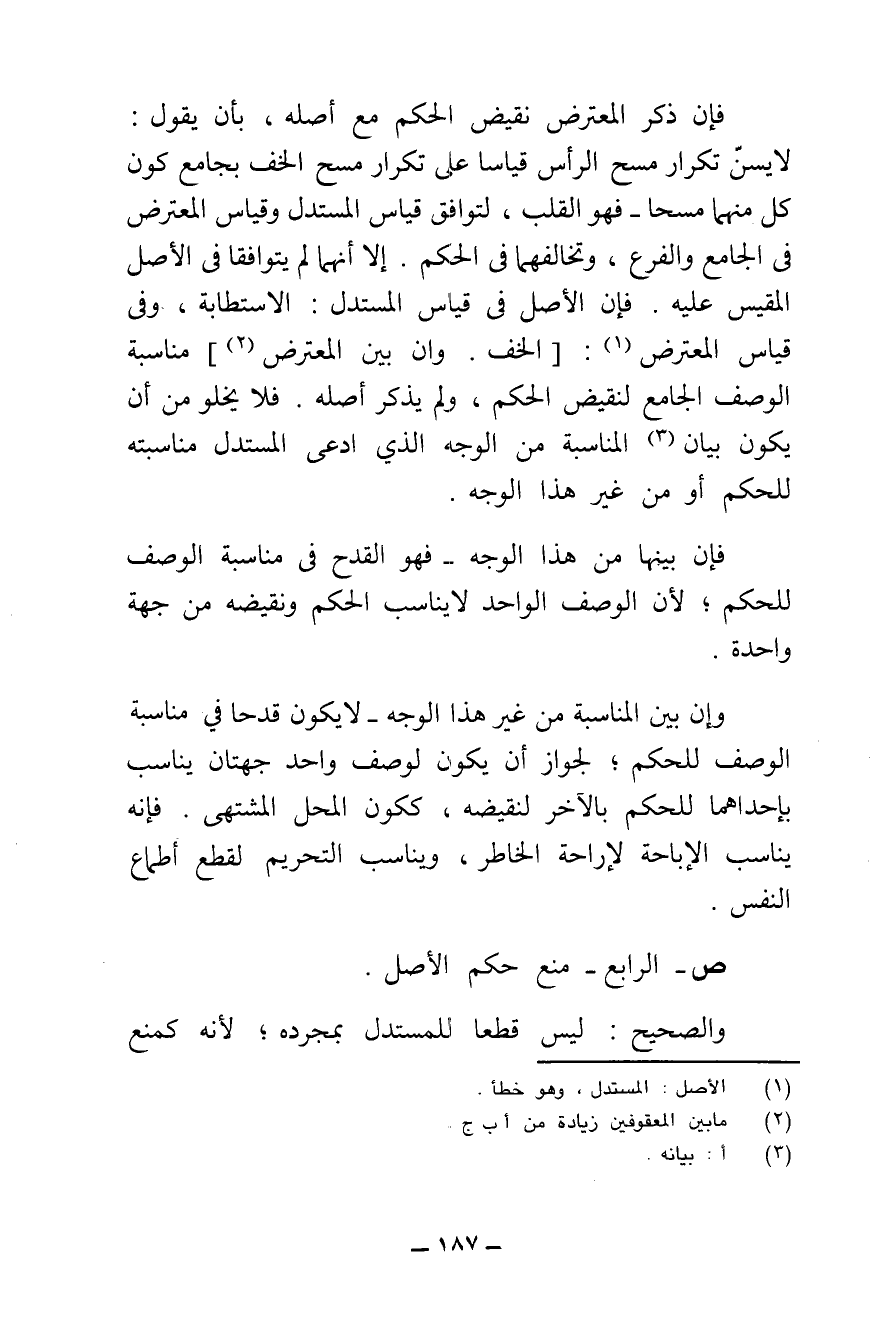 ش - الِاعْتِرَاضُ الرَّابِعُ: مَنْعُ الْمُعْتَرِضِ حُكْمَ الْأَصْلِ، مِثَالُهُ: قَوْلُ الشَّافِعِيِّ فِي عَدَمِ إِزَالَةِ الْخَبَثِ بِالْخَلِّ: مَائِعٌ لَا يَرْفَعُ الْحَدَثَ، فَلَا يُزِيلُ الْخَبَثَ، قِيَاسًا عَلَى الدُّهْنِ. فَيَقُولُ الْمُعْتَرِضُ: لَا نُسَلِّمُ أَنَّ الدُّهْنَ لَا يُزِيلُ الْخَبَثَ.