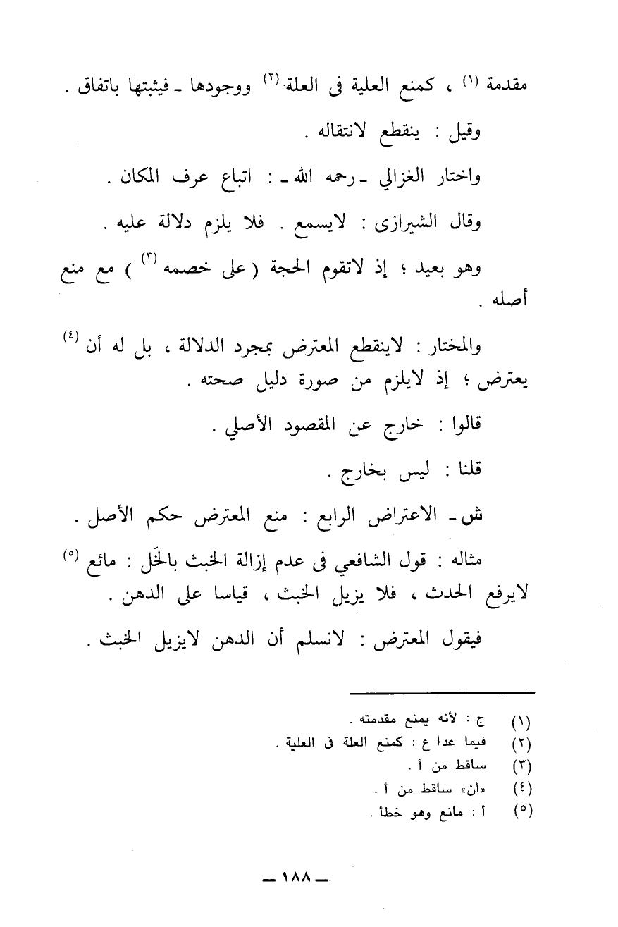 مُقَدِّمَةٍ، كَمَنْعِ الْعِلِّيَّةِ فِي الْعِلَّةِ وَوُجُودِهَا، فَيُثْبِتُهَا بِاتِّفَاقٍ.