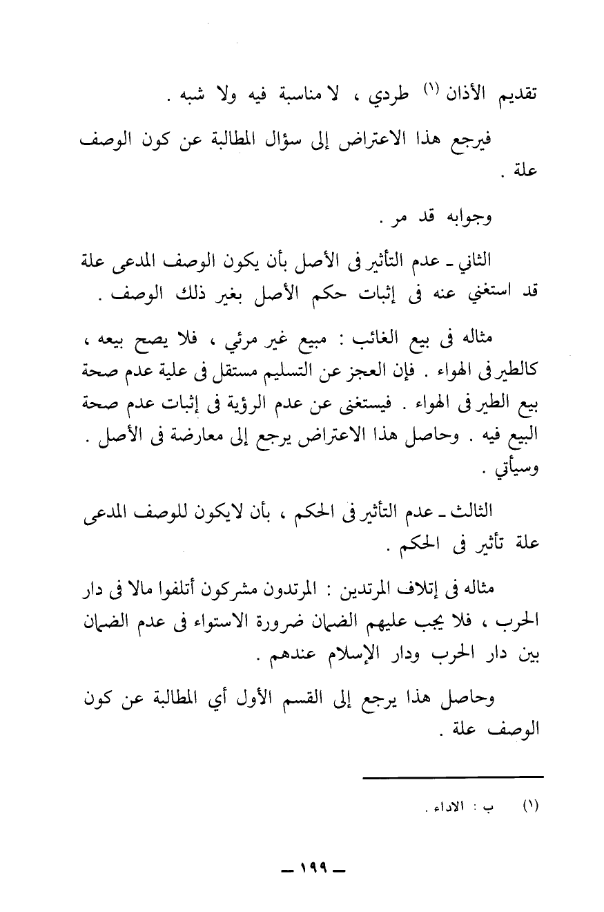 الثَّانِي: عَدَمُ التَّأْثِيرِ فِي الْأَصْلِ بِأَنْ يَكُونَ الْوَصْفُ الْمُدَّعَى عِلَّةً، قَدِ اسْتُغْنِيَ عَنْهُ فِي إِثْبَاتِ حُكْمِ الْأَصْلِ بِغَيْرِ ذَلِكَ الْوَصْفِ، مِثَالُهُ فِي بَيْعِ الْغَائِبِ: مَبِيعٌ غَيْرُ مَرْئِيٍّ، فَلَا يَصِحُّ بَيْعُهُ، كَالطَّيْرِ فِي الْهَوَاءِ، فَإِنَّ الْعَجْزَ عَنِ التَّسْلِيمِ مُسْتَقِلٌّ فِي عِلِّيَّةِ عَدَمِ صِحَّةِ بَيْعِ الطَّيْرِ فِي الْهَوَاءِ. فَيُسْتَغْنَى عَنْ عَدَمِ الرُّؤْيَةِ فِي إِثْبَاتِ عَدَمِ صِحَّةِ الْبَيْعِ فِيهِ، وَحَاصِلُ هَذَا الِاعْتِرَاضِ يَرْجِعُ إِلَى مُعَارَضَةٍ فِي الْأَصْلِ، وَسَيَأْتِي.