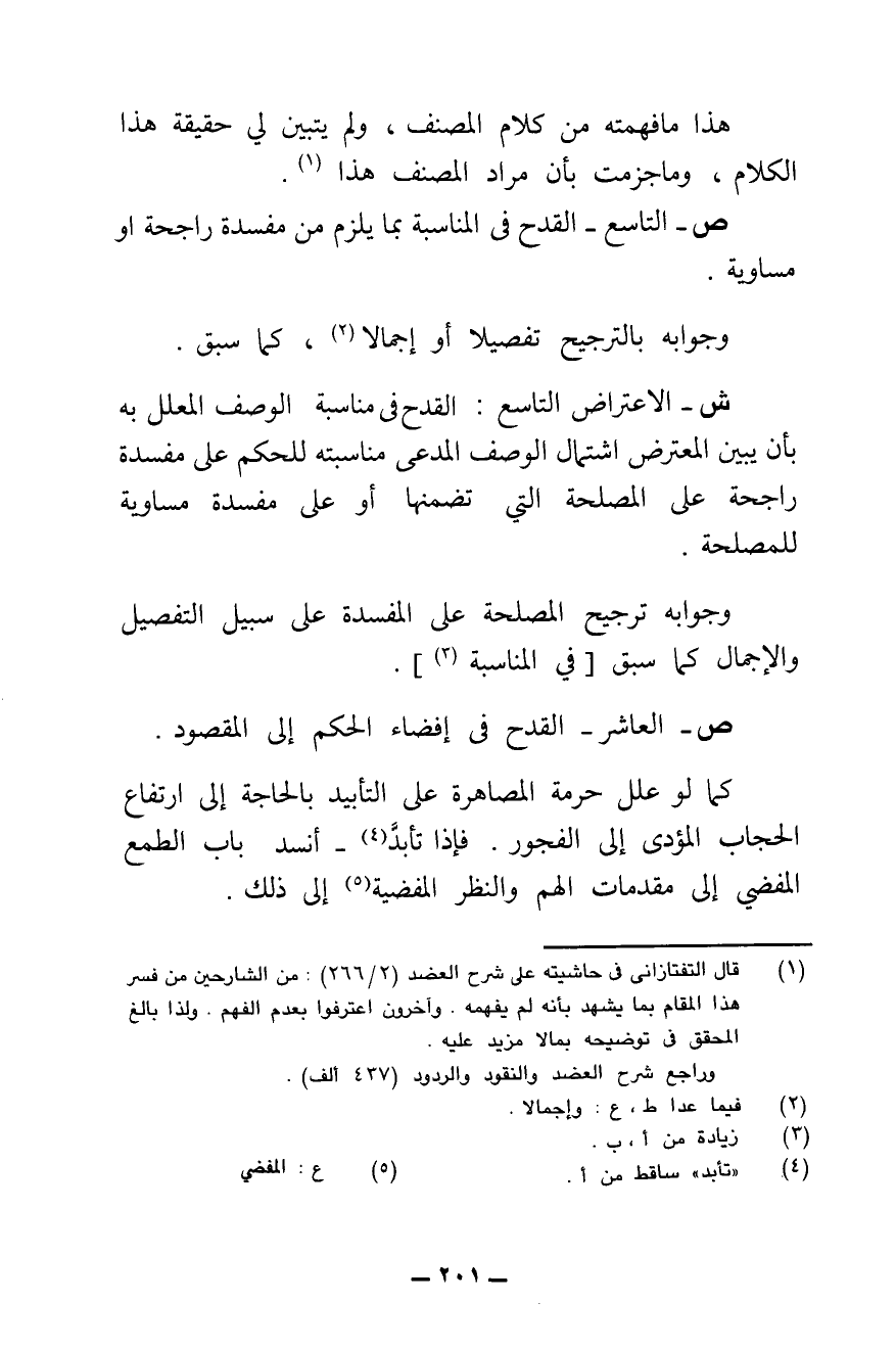 ش - الِاعْتِرَاضُ التَّاسِعُ: الْقَدْحُ فِي مُنَاسَبَةِ الْوَصْفِ الْمُعَلَّلِ بِهِ، بِأَنْ يُبَيِّنَ الْمُعْتَرِضُ اشْتِمَالَ الْوَصْفِ الْمُدَّعَى مُنَاسَبَتُهُ لِلْحُكْمِ عَلَى مَفْسَدَةٍ رَاجِحَةٍ عَلَى الْمَصْلَحَةِ الَّتِي تَضَمَّنَهَا، أَوْ عَلَى مَفْسَدَةٍ مُسَاوِيَةٍ لِلْمَصْلَحَةِ، وَجَوَابُهُ تَرْجِيحُ الْمَصْلَحَةِ عَلَى الْمَفْسَدَةِ عَلَى سَبِيلِ التَّفْصِيلِ وَالْإِجْمَالِ، كَمَا سَبَقَ فِي الْمُنَاسَبَةِ.