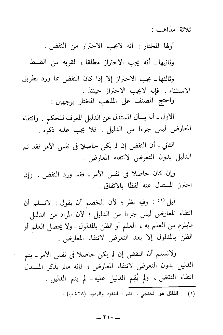 وَثَالِثُهَا: يَجِبُ الِاحْتِرَازُ إِلَّا إِذَا كَانَ النَّقْضُ مِمَّا وَرَدَ بِطَرِيقِ الِاسْتِثْنَاءِ، فَإِنَّهُ لَا يَجِبُ الِاحْتِرَازُ حِينَئِذٍ.