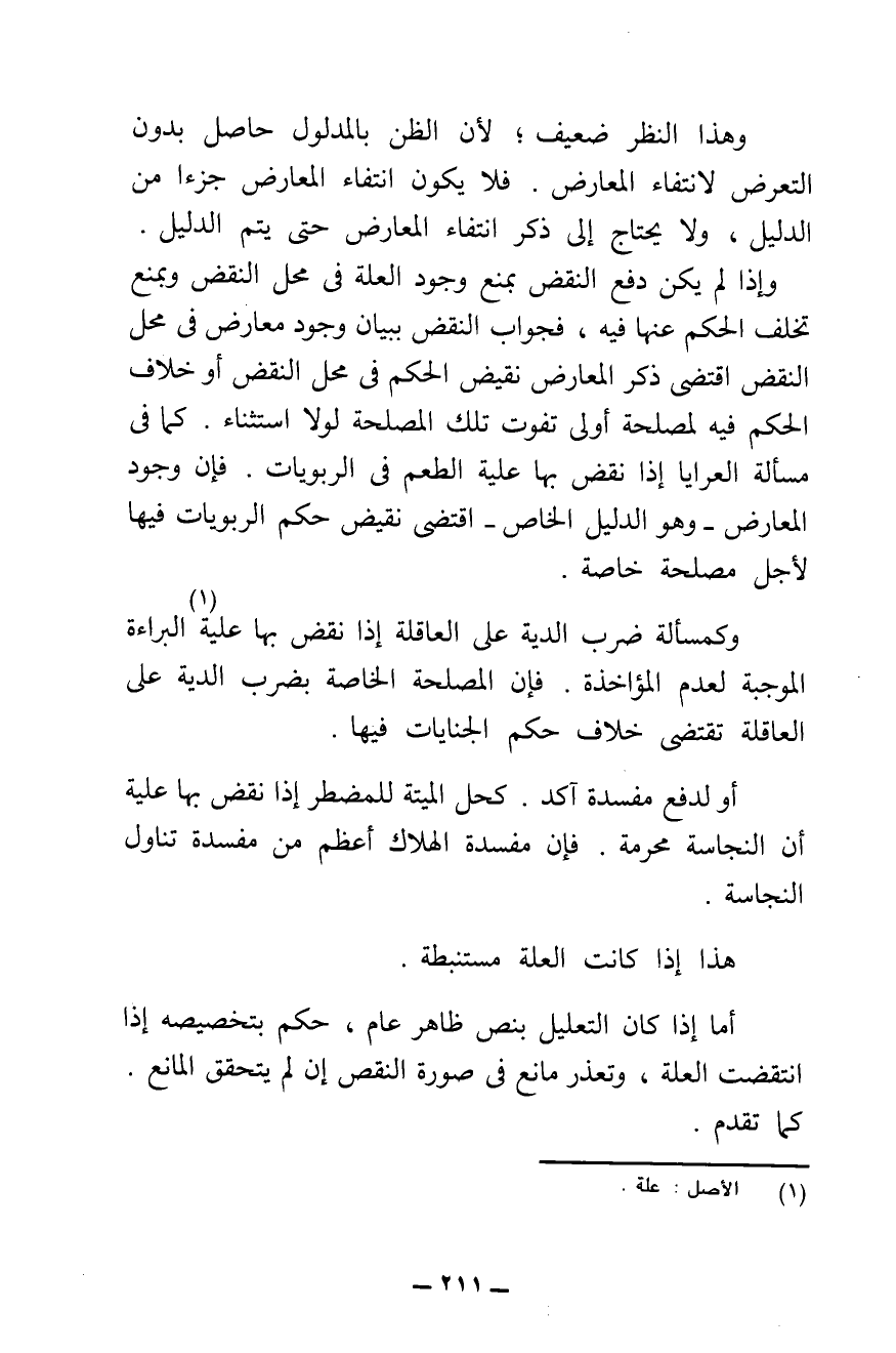 وَهَذَا النَّظَرُ ضَعِيفٌ ; لِأَنَّ الظَّنَّ بِالْمَدْلُولِ حَاصِلٌ بِدُونِ التَّعَرُّضِ لِانْتِفَاءِ الْمُعَارِضِ، فَلَا يَكُونُ انْتِفَاءُ الْمُعَارِضِ جُزْءًا مِنَ الدَّلِيلِ، وَلَا يَحْتَاجُ إِلَى ذِكْرِ انْتِفَاءِ الْمُعَارِضِ حَتَّى يَتِمَّ الدَّلِيلُ، وَإِذَا لَمْ يَكُنْ دَفْعُ النَّقْضِ بِمَنْعِ وُجُودِ الْعِلَّةِ فِي مَحَلِّ النَّقْضِ، وَبِمَنْعِ تَخَلُّفِ الْحُكْمِ عَنْهَا فِيهِ، فَجَوَابُ النَّقْضِ بِبَيَانِ وُجُودِ مُعَارِضٍ فِي مَحَلِّ النَّقْضِ اقْتَضَى ذِكْرُ الْمُعَارِضِ نَقِيضَ الْحُكْمِ فِي مَحَلِّ النَّقْضِ، أَوْ خِلَافَ الْحُكْمِ فِيهِ لِمَصْلَحَةِ أَوْلَى تُفَوِّتُ تِلْكَ الْمَصْلَحَةَ لَوْلَا اسْتِثْنَاءٌ، كَمَا فِي مَسْأَلَةِ الْعَرَايَا إِذَا نُقِضَ بِهَا عِلِّيَّةُ الطَّعْمِ فِي الرِّبَوِيَّاتِ، فَإِنَّ وُجُودَ الْمُعَارِضِ - وَهُوَ الدَّلِيلُ الْخَاصُّ - اقْتَضَى نَقِيضَ حُكْمِ الرِّبَوِيَّاتِ فِيهَا لِأَجْلِ مَصْلَحَةٍ خَاصَّةٍ.