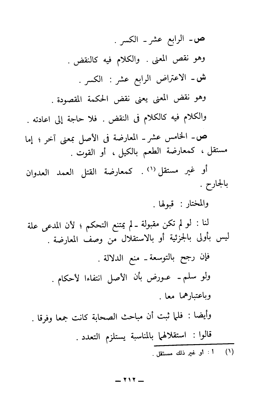 ص - الرَّابِعَ عَشَرَ: الْكَسْرُ، وَهُوَ نَقْصُ الْمَعْنَى. وَالْكَلَامُ فِيهِ كَالنَّقْضِ.