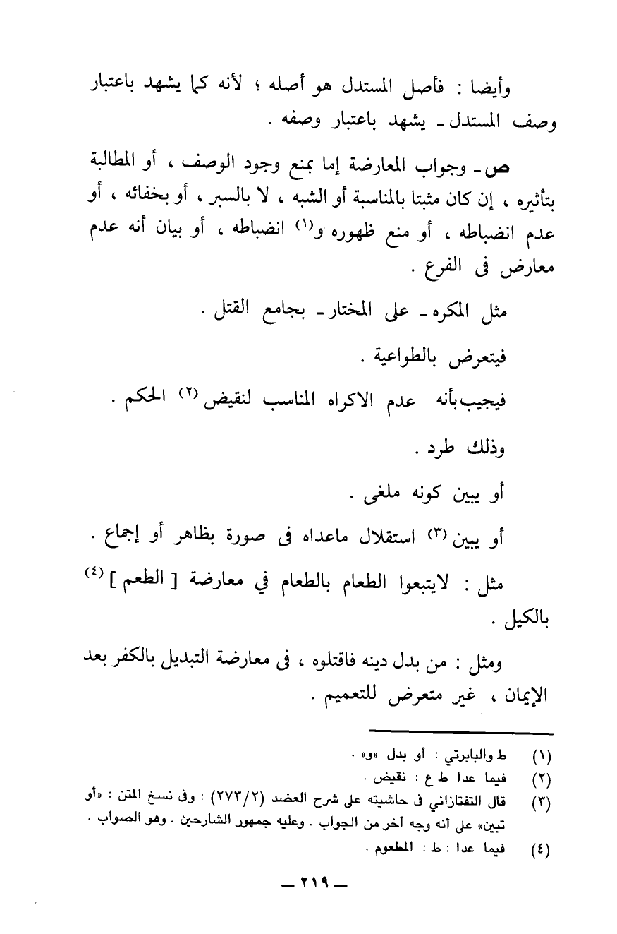 ش - وَجَوَابُ الْمُسْتَدِلِّ عَنِ الْمُعَارَضَةِ إِمَّا بِمَنْعِ وُجُودِ وَصْفِ الْمُعَارَضَةِ فِي الْأَصْلِ، وَإِمَّا بِمُطَالَبَةِ الْمُسْتَدِلِّ الْمُعْتَرِضِ بِتَأْثِيرِ وَصْفِ الْمُعَارَضَةِ، إِنْ كَانَ الْمُعْتَرِضُ أَثْبَتَ عِلِّيَّتَهُ بِالْمُنَاسَبَةِ أَوْ بِالشَّبَهِ.