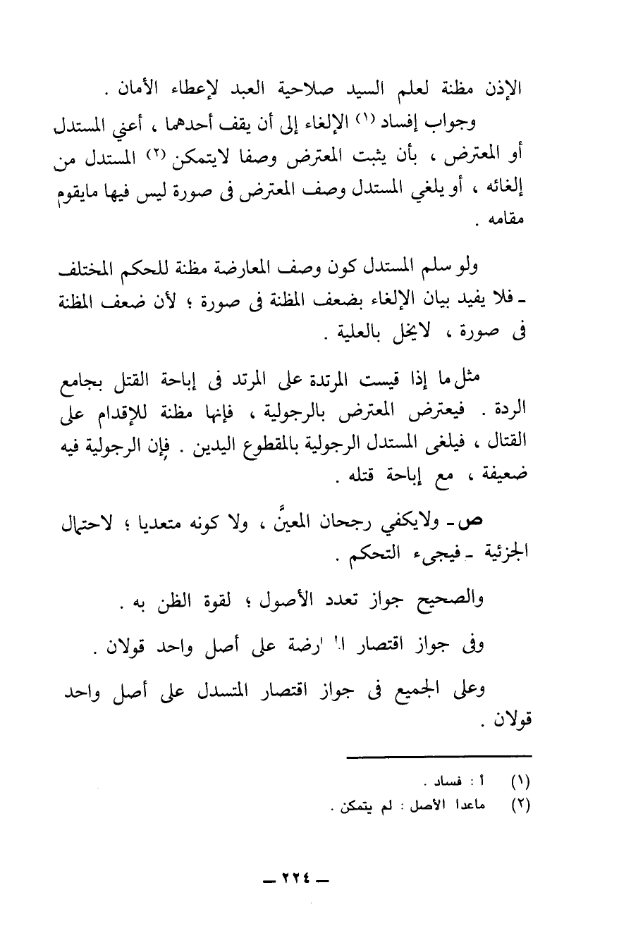 الْإِذْنَ مِظَنَّةٌ لِعِلْمِ السَّيِّدِ صَلَاحِيَةَ الْعَبْدِ لِإِعْطَاءِ الْأَمَانِ. وَجَوَابُ إِفْسَادِ الْإِلْغَاءِ إِلَى أَنْ يَقِفَ أَحَدُهُمَا، أَعْنِي الْمُسْتَدِلُّ أَوِ الْمُعْتَرِضُ، بِأَنْ يُثْبِتَ الْمُعْتَرِضُ وَصْفًا لَا يَتَمَكَّنُ الْمُسْتَدِلُّ مِنْ إِلْغَائِهِ، أَوْ يُلْغِي الْمُسْتَدِلُّ وَصْفَ الْمُعْتَرِضِ فِي صُورَةٍ لَيْسَ فِيهَا مَا يَقُومُ مَقَامَهُ.