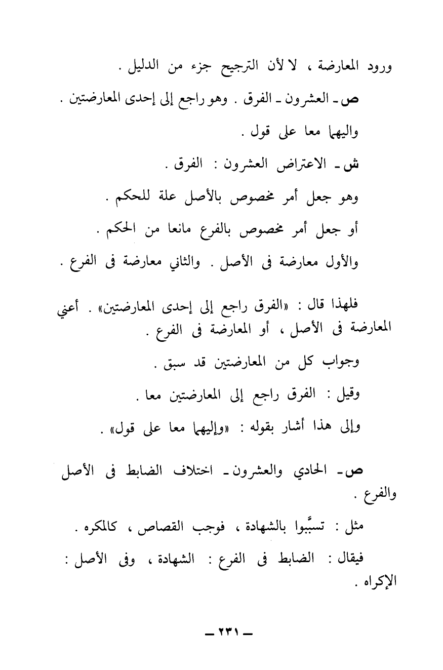 ش - الِاعْتِرَاضُ الْعِشْرُونَ: الْفَرْقُ، وَهُوَ جَعْلُ أَمْرٍ مَخْصُوصٍ بِالْأَصْلِ عِلَّةً لِلْحُكْمِ، أَوْ جَعْلُ أَمْرٍ مَخْصُوصٍ بِالْفَرْعِ مَانِعًا مِنَ الْحُكْمِ. وَالْأَوَّلُ مُعَارَضَةٌ فِي الْأَصْلِ، وَالثَّانِي مُعَارَضَةٌ فِي الْفَرْعِ.