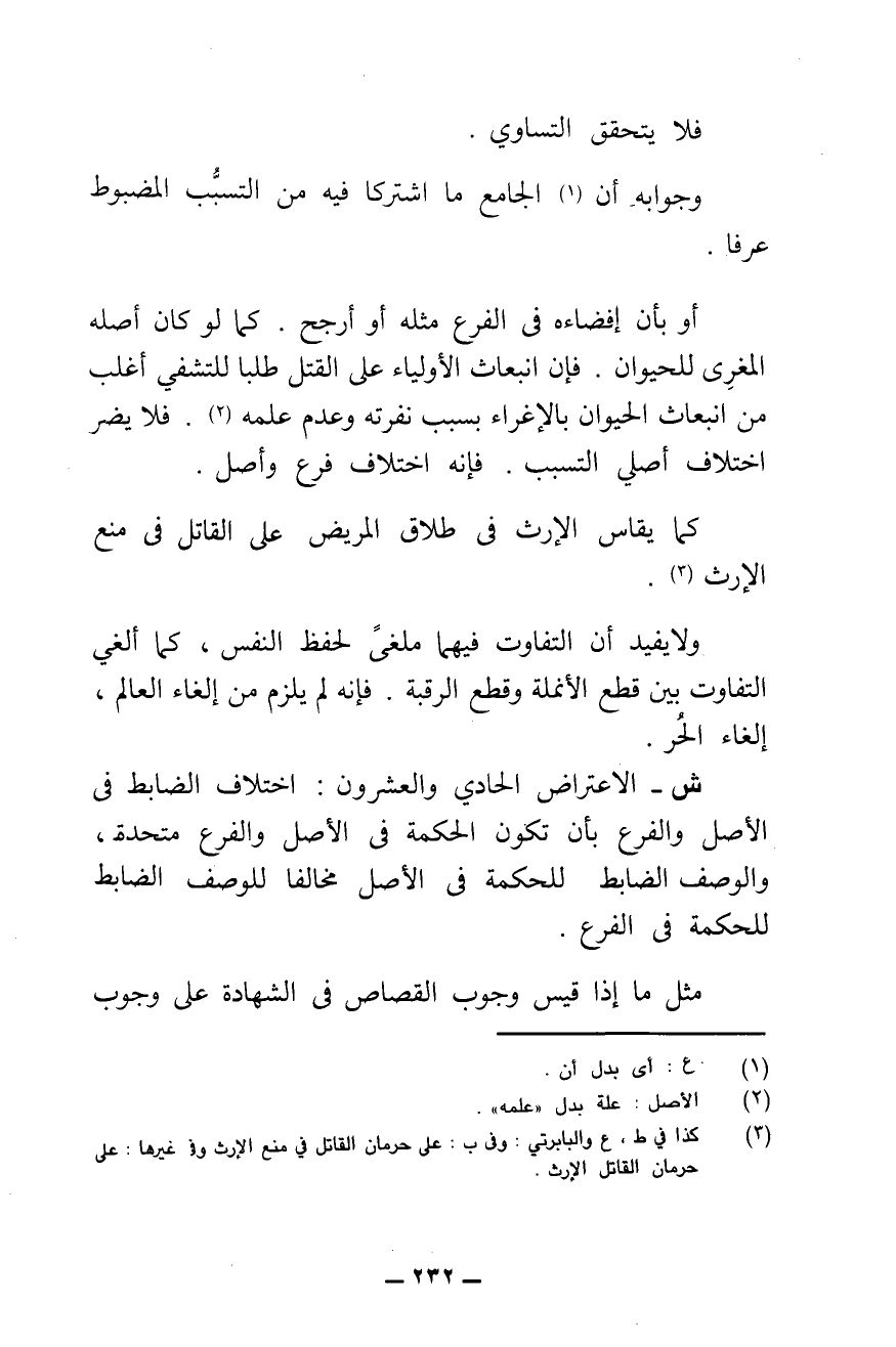 كَمَا يُقَاسُ الْإِرْثُ فِي طَلَاقِ الْمَرِيضِ عَلَى الْقَاتِلِ فِي مَنْعِ الْإِرْثِ، وَلَا يُفِيدُ أَنَّ التَّفَاوُتَ فِيهِمَا مُلْغًى لِحِفْظِ النَّفْسِ، كَمَا أُلْغِيَ التَّفَاوُتُ بَيْنَ قَطْعِ الْأُنْمُلَةِ وَقَطْعِ الرَّقَبَةِ. فَإِنَّهُ لَمْ يَلْزَمْ مِنْ إِلْغَاءِ الْعَالَمِ إِلْغَاءُ الْحُرِّ.