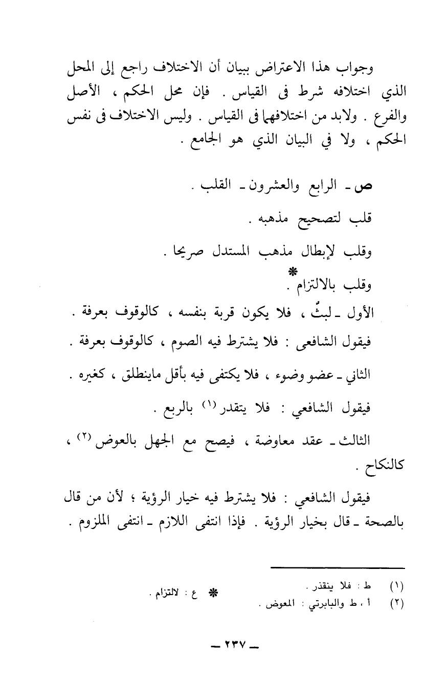 ش - الِاعْتِرَاضُ الرَّابِعُ وَالْعِشْرُونَ: الْقَلْبُ، وَهُوَ تَعْلِيقُ نَقِيضِ الْحُكْمِ الْمَذْكُورِ أَوْ لَازِمِ نَقِيضِهِ عَلَى الْعِلَّةِ الْمَذْكُورَةِ إِلْحَاقًا بِالْأَصْلِ الْمَذْكُورِ.